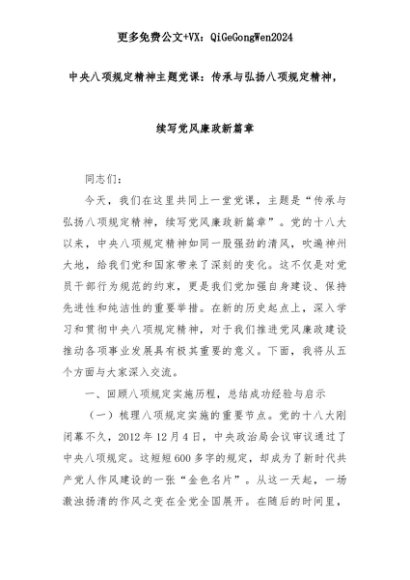 【七哥公文】2025年:中央八项规定精神主题党课:传承与弘扬八项规定精神,续写党风廉政新篇章+更多免费公文+VX:QiGeGongWen2024+更多免费公文+VX:QiGeGongWen2024