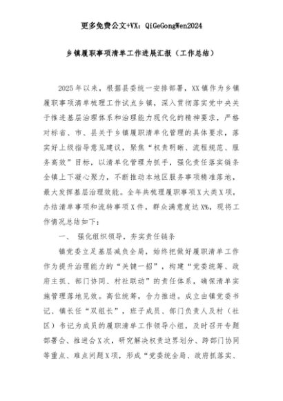 【七哥公文】2025年:乡镇履职事项清单工作进展汇报(工作总结)+更多免费公文+VX:QiGeGongWen2024+更多免费公文+VX:QiGeGongWen2024