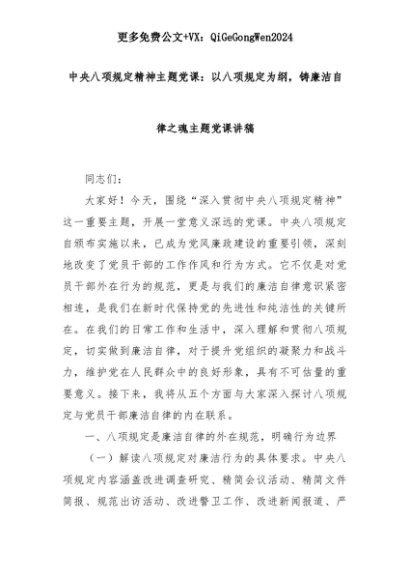 【七哥公文】2025年:中央八项规定精神主题党课:以八项规定为纲,铸廉洁自律之魂主题党课讲稿+更多免费公文+VX:QiGeGongWen2024+更多免费公文+VX:QiGeGongWen2024