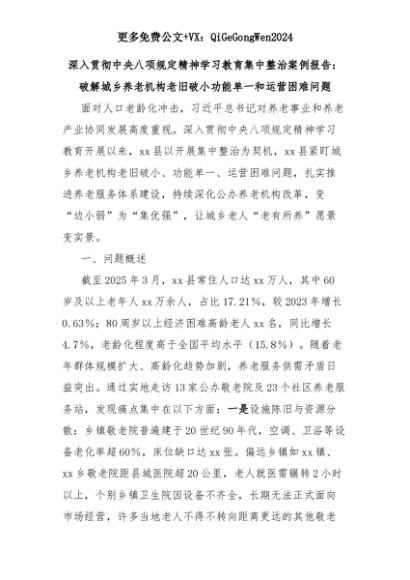 【七哥公文】2025年:深入贯彻中央八项规定精神学习教育集中整治案例报告:破解城乡养老机构老旧破小功能单一和运营困难问题+更多免费公文+VX:QiGeGongWen2024+更多免费公文+VX:QiGeGongWen2024