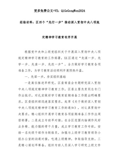 【七哥公文】2025年:经验材料:区四个“先行一步”推动深入贯彻中央八项规定精神学习教育有序开展+更多免费公文+VX:QiGeGongWen2024+更多免费公文+VX:QiGeGongWen2024