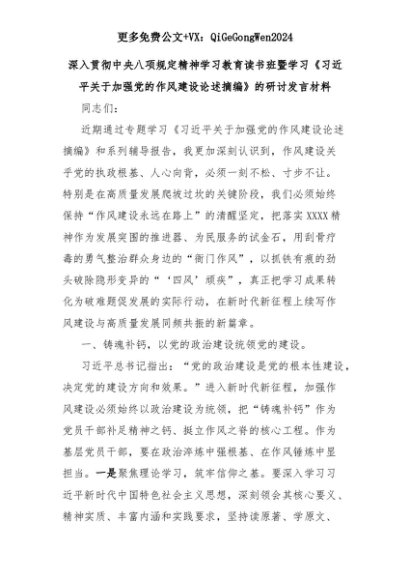 【七哥公文】2025年:深入贯彻中央八项规定精神学习教育读书班暨学习《习近平关于加强党的作风建设论述摘编》的研讨发言材料+更多免费公文+VX:QiGeGongWen2024+更多免费公文+VX:QiGeGongWen2024