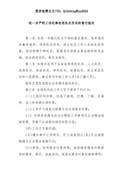 【七哥公文】2025年:进一步严明工作纪律改进机关作风的暂行规定+更多免费公文+VX:QiGeGongWen2024+更多免费公文+VX:QiGeGongWen2024