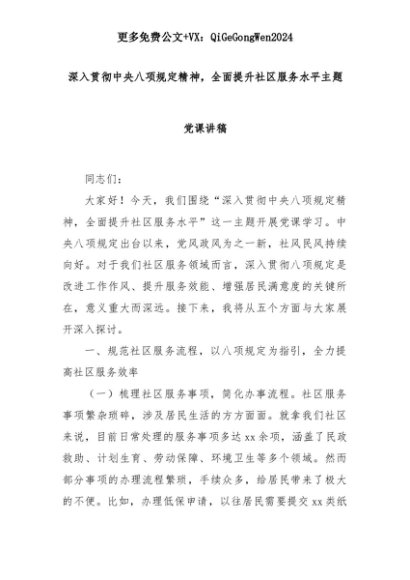 【七哥公文】2025年:深入贯彻中央八项规定精神,全面提升社区服务水平主题党课讲稿+更多免费公文+VX:QiGeGongWen2024+更多免费公文+VX:QiGeGongWen2024