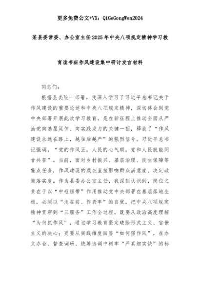 【七哥公文】2025年:某县委常委、办公室主任2025年中央八项规定精神学习教育读书班作风建设集中研讨发言材料+更多免费公文+VX:QiGeGongWen2024+更多免费公文+VX:QiGeGongWen2024
