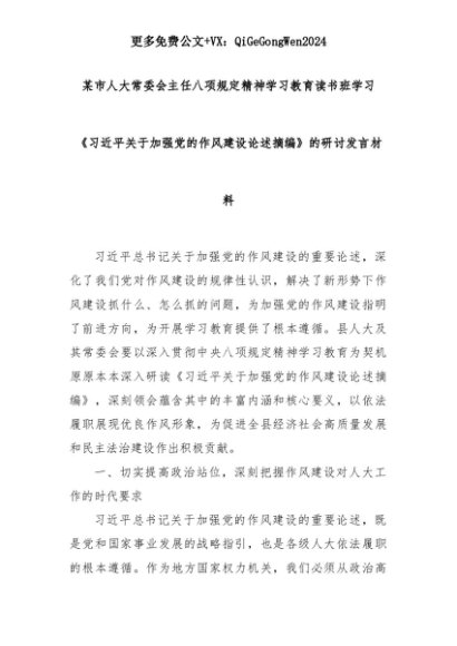 【七哥公文】2025年:某市人大常委会主任八项规定精神学习教育读书班学习《总书记关于加强党的作风建设论述摘编》的研讨发言材料+更多免费公文+VX:QiGeGongWen2024+更多免费公文+VX:QiGeGongWen2024