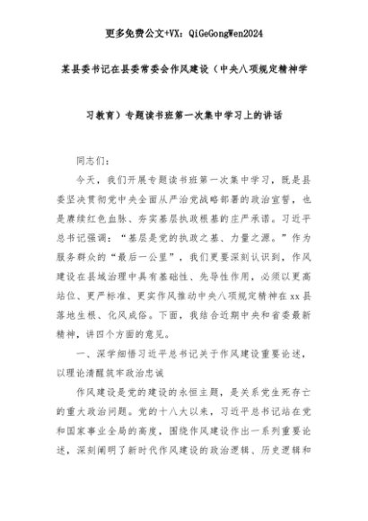 【七哥公文】2025年:某县委书记在县委常委会作风建设(中央八项规定精神学习教育)专题读书班第一次集中学习上的讲话+更多免费公文+VX:QiGeGongWen2024+更多免费公文+VX:QiGeGongWen2024