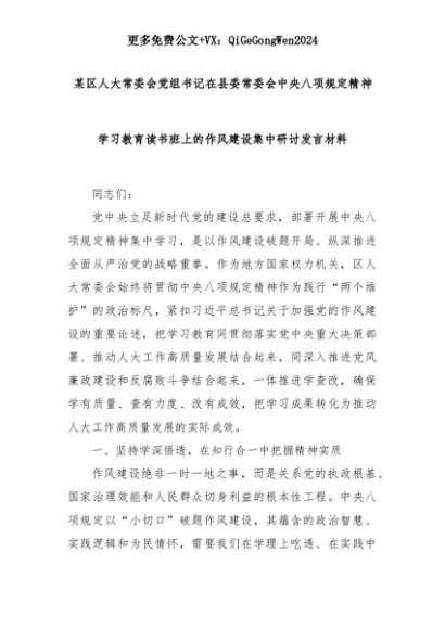 【七哥公文】2025年:某区人大常委会党组书记在县委常委会中央八项规定精神学习教育读书班上的作风建设集中研讨发言材料+更多免费公文+VX:QiGeGongWen2024+更多免费公文+VX:QiGeGongWen2024