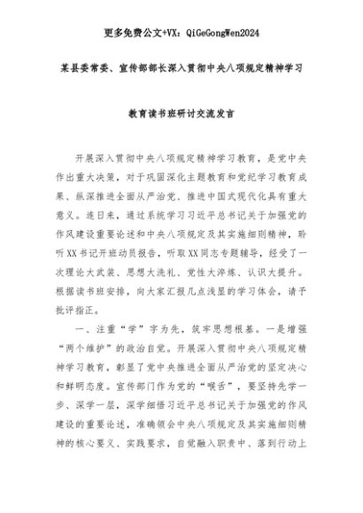 【七哥公文】2025年:某县委常委、宣传部部长深入贯彻中央八项规定精神学习教育读书班研讨交流发言+更多免费公文+VX:QiGeGongWen2024+更多免费公文+VX:QiGeGongWen2024