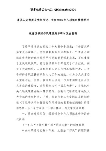 【七哥公文】2025年:某县人大常委会党组书记、主任2025年八项规定精神学习教育读书班作风建设集中研讨发言材料+更多免费公文+VX:QiGeGongWen2024+更多免费公文+VX:QiGeGongWen2024