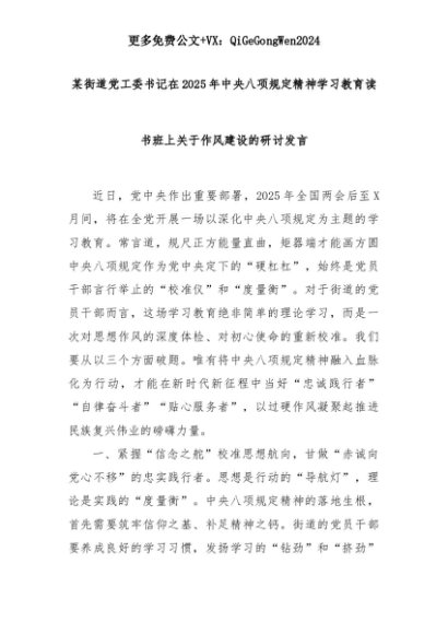 【七哥公文】2025年:某街道党工委书记在2025年中央八项规定精神学习教育读书班上关于作风建设的研讨发言+更多免费公文+VX:QiGeGongWen2024+更多免费公文+VX:QiGeGongWen2024