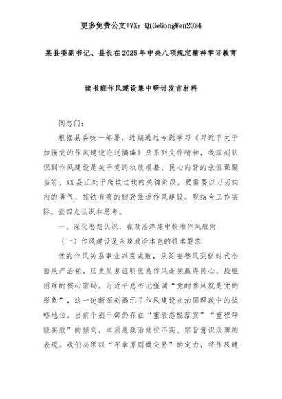 【七哥公文】2025年:某县委副书记、县长在2025年中央八项规定精神学习教育读书班作风建设集中研讨发言材料+更多免费公文+VX:QiGeGongWen2024+更多免费公文+VX:QiGeGongWen2024