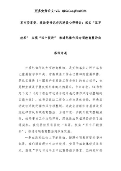 【七哥公文】2025年:某市委常委、政法委书记作风建设心得研讨:抓实“五不放松” 实现“四个促进” 推进纪律作风专项教育整治向纵深开展+更多免费公文+VX:QiGeGongWen2024+更多免费公文+VX:QiGeGongWen2024
