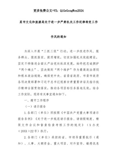 【七哥公文】2025年:某市文化和旅游局关于进一步严肃机关工作纪律转变工作作风的通知+更多免费公文+VX:QiGeGongWen2024+更多免费公文+VX:QiGeGongWen2024
