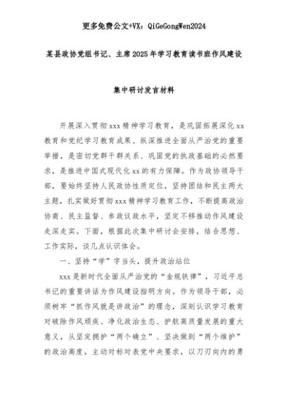 【七哥公文】2025年:某县政协党组书记、主席2025年学习教育读书班作风建设集中研讨发言材料+更多免费公文+VX:QiGeGongWen2024+更多免费公文+VX:QiGeGongWen2024