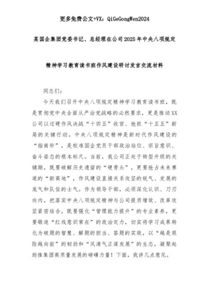 【七哥公文】2025年:某国企集团党委书记、总经理在公司2025年中央八项规定精神学习教育读书班作风建设研讨发言交流材料+更多免费公文+VX:QiGeGongWen2024+更多免费公文+VX:QiGeGongWen2024