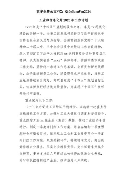 【七哥公文】2025年:工业和信息化局2025年工作计划+更多免费公文+VX:QiGeGongWen2024+更多免费公文+VX:QiGeGongWen2024