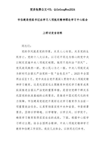 【七哥公文】2025年:市住建局党组书记在学习八项规定精神理论学习中心组会上研讨发言材料+更多免费公文+VX:QiGeGongWen2024+更多免费公文+VX:QiGeGongWen2024