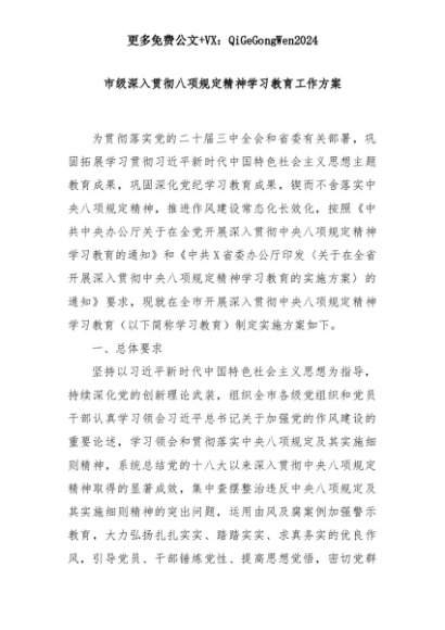【七哥公文】2025年:市级深入贯彻八项规定精神学习教育工作方案+更多免费公文+VX:QiGeGongWen2024+更多免费公文+VX:QiGeGongWen2024