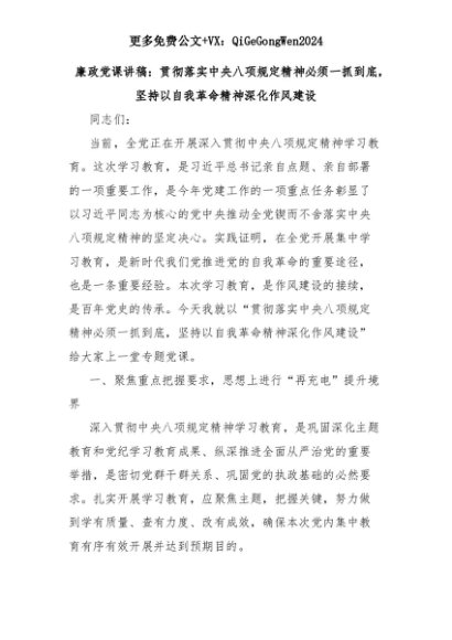 【七哥公文】2025年:廉政党课讲稿:贯彻落实中央八项规定精神必须一抓到底,坚持以自我革命精神深化作风建设+更多免费公文+VX:QiGeGongWen2024+更多免费公文+VX:QiGeGongWen2024