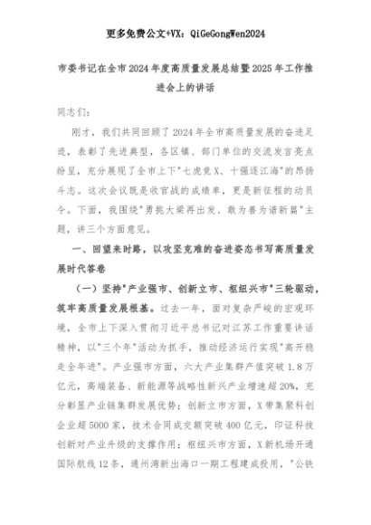 【七哥公文】2025年:市委书记在全市2024年度高质量发展总结暨2025年工作推进会上的讲话+更多免费公文+VX:QiGeGongWen2024+更多免费公文+VX:QiGeGongWen2024
