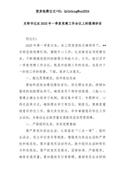 【七哥公文】2025年:支部书记在2025年一季度党建工作会议上的强调讲话+更多免费公文+VX:QiGeGongWen2024+更多免费公文+VX:QiGeGongWen2024