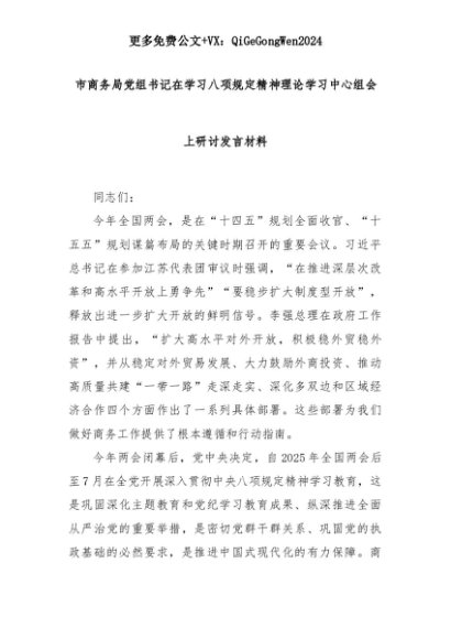 【七哥公文】2025年:市商务局党组书记在学习八项规定精神理论学习中心组会上研讨发言材料+更多免费公文+VX:QiGeGongWen2024+更多免费公文+VX:QiGeGongWen2024