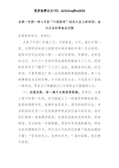 【七哥公文】2025年:在高一年级一部4月份“六校联考”动员大会上的讲话:奋斗正当时青春当无悔+更多免费公文+VX:QiGeGongWen2024+更多免费公文+VX:QiGeGongWen2024