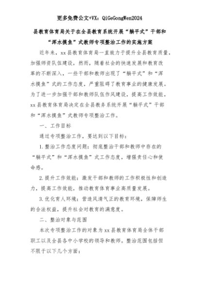 【七哥公文】2025年:县教育体育局关于在全县教育系统开展“躺平式”干部和“浑水摸鱼”式教师专项整治工作的实施方案+更多免费公文+VX:QiGeGongWen2024+更多免费公文+VX:QiGeGongWen2024