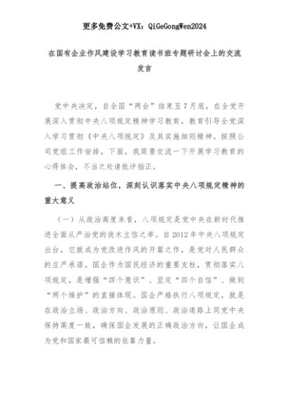 【七哥公文】2025年:在国有企业作风建设学习教育读书班专题研讨会上的交流发言+更多免费公文+VX:QiGeGongWen2024+更多免费公文+VX:QiGeGongWen2024