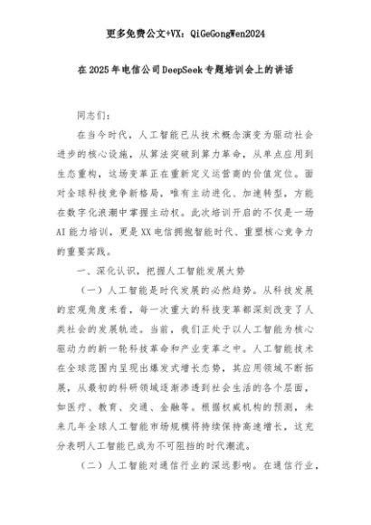 【七哥公文】2025年:在2025年电信公司DeepSeek专题培训会上的讲话+更多免费公文+VX:QiGeGongWen2024+更多免费公文+VX:QiGeGongWen2024