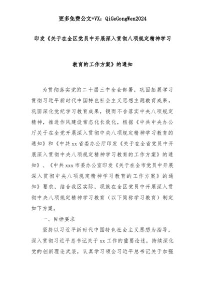 【七哥公文】2025年:印发《关于在全区党员中开展深入贯彻八项规定精神学习教育的工作方案》的通知+更多免费公文+VX:QiGeGongWen2024+更多免费公文+VX:QiGeGongWen2024