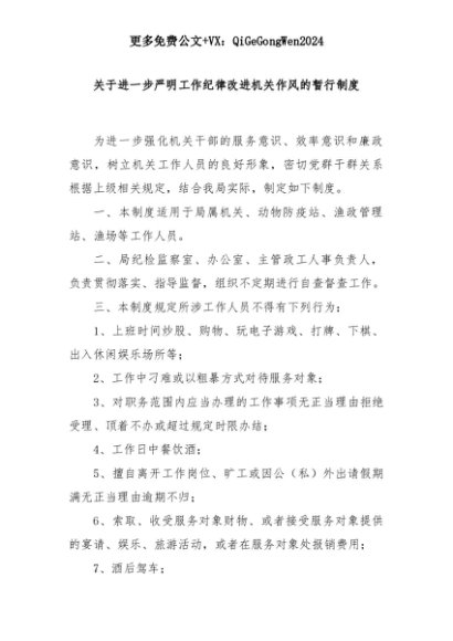 【七哥公文】2025年:关于进一步严明工作纪律改进机关作风的暂行制度+更多免费公文+VX:QiGeGongWen2024+更多免费公文+VX:QiGeGongWen2024