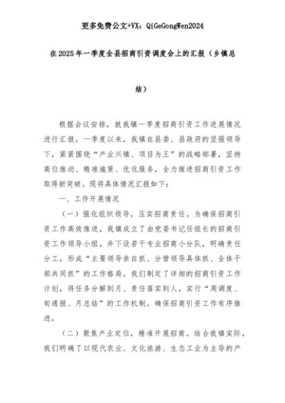 【七哥公文】2025年:在2025年一季度全县招商引资调度会上的汇报(乡镇总结)+更多免费公文+VX:QiGeGongWen2024+更多免费公文+VX:QiGeGongWen2024