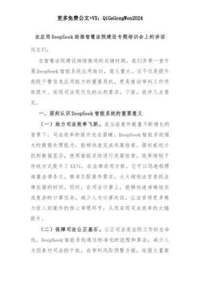 【七哥公文】2025年:在应用DeepSeek助推智慧法院建设专题培训会上的讲话+更多免费公文+VX:QiGeGongWen2024+更多免费公文+VX:QiGeGongWen2024