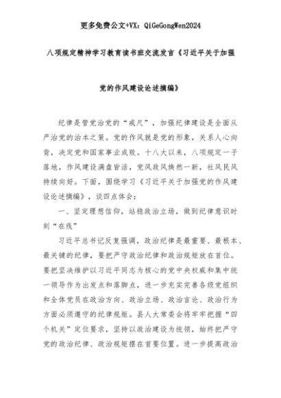 【七哥公文】2025年:八项规定精神学习教育读书班交流发言《总书记关于加强党的作风建设论述摘编》+更多免费公文+VX:QiGeGongWen2024+更多免费公文+VX:QiGeGongWen2024
