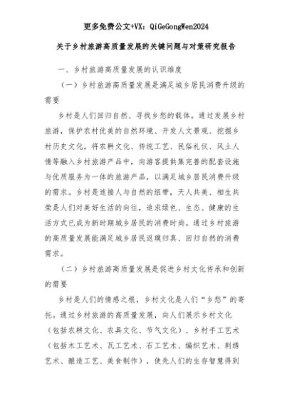 【七哥公文】2025年:关于乡村旅游高质量发展的关键问题与对策研究报告+更多免费公文+VX:QiGeGongWen2024+更多免费公文+VX:QiGeGongWen2024