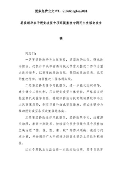 【七哥公文】2025年:县委领导班子脱贫攻坚专项巡视整改专题民主生活会发言稿+更多免费公文+VX:QiGeGongWen2024+更多免费公文+VX:QiGeGongWen2024