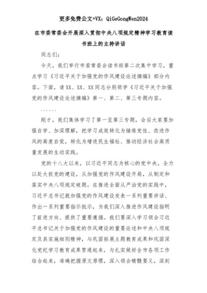 【七哥公文】2025年:在市委常委会开展深入贯彻中央八项规定精神学习教育读书班上的主持讲话+更多免费公文+VX:QiGeGongWen2024+更多免费公文+VX:QiGeGongWen2024