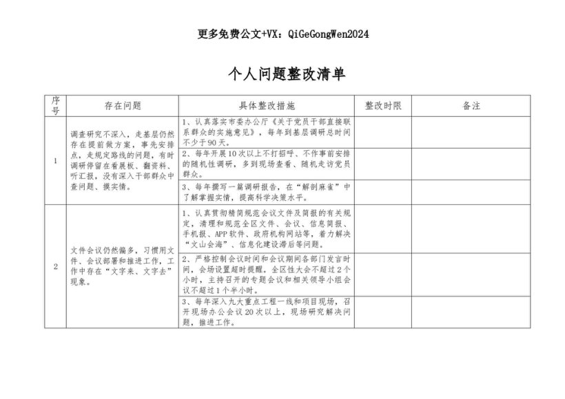 【七哥公文】2025年:八项规定个人问题整改清单台账(17个问题及措施,3800字)+更多免费公文+VX:QiGeGongWen2024+更多免费公文+VX:QiGeGongWen2024