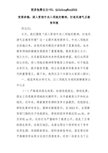 【七哥公文】2025年:党课讲稿:深入贯彻中央八项规定精神,打造风清气正教育环境+更多免费公文+VX:QiGeGongWen2024+更多免费公文+VX:QiGeGongWen2024