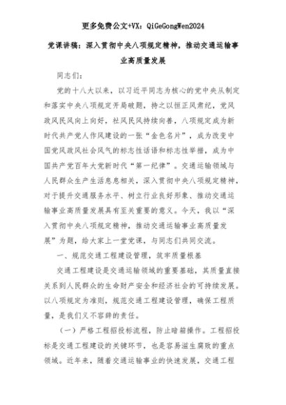 【七哥公文】2025年:党课讲稿:深入贯彻中央八项规定精神,推动交通运输事业高质量发展+更多免费公文+VX:QiGeGongWen2024+更多免费公文+VX:QiGeGongWen2024