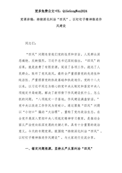 【七哥公文】2025年:党课讲稿:持续深化纠治“四风”,以钉钉子精神推进作风建设+更多免费公文+VX:QiGeGongWen2024+更多免费公文+VX:QiGeGongWen2024