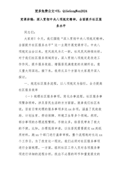 【七哥公文】2025年:党课讲稿:深入贯彻中央八项规定精神,全面提升社区服务水平+更多免费公文+VX:QiGeGongWen2024+更多免费公文+VX:QiGeGongWen2024