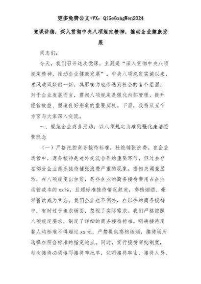 【七哥公文】2025年:党课讲稿:深入贯彻中央八项规定精神,推动企业健康发展+更多免费公文+VX:QiGeGongWen2024+更多免费公文+VX:QiGeGongWen2024