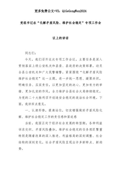 【七哥公文】2025年:党组书记在“化解矛盾风险、维护社会稳定”专项工作会议上的讲话+更多免费公文+VX:QiGeGongWen2024+更多免费公文+VX:QiGeGongWen2024