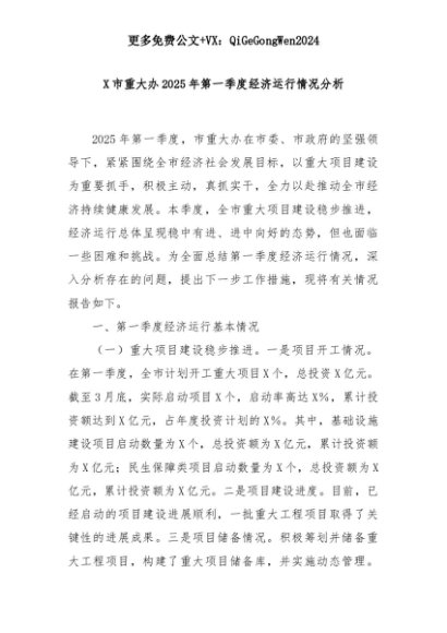 【七哥公文】2025年:X市重大办2025年第一季度经济运行情况分析+更多免费公文+VX:QiGeGongWen2024+更多免费公文+VX:QiGeGongWen2024