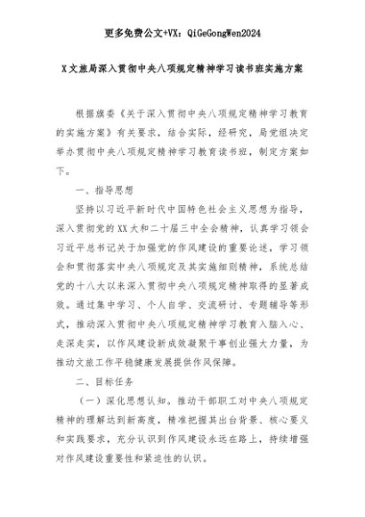 【七哥公文】2025年:X文旅局深入贯彻中央八项规定精神学习读书班实施方案+更多免费公文+VX:QiGeGongWen2024+更多免费公文+VX:QiGeGongWen2024