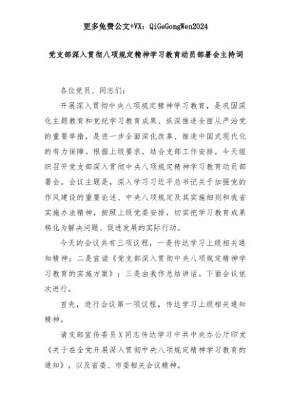 【七哥公文】2025年:党支部深入贯彻八项规定精神学习教育动员部署会主持词+更多免费公文+VX:QiGeGongWen2024+更多免费公文+VX:QiGeGongWen2024