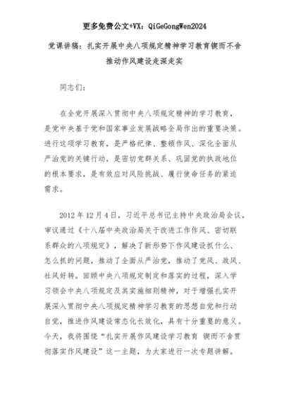 【七哥公文】2025年:党课讲稿:扎实开展中央八项规定精神学习教育锲而不舍推动作风建设走深走实+更多免费公文+VX:QiGeGongWen2024+更多免费公文+VX:QiGeGongWen2024